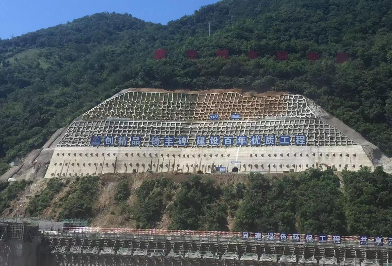 本工程試驗區(qū)位于黃金峽大壩右岸壩肩框格梁混凝土邊坡內(nèi),高程范圍為EL488m~EL512m,坡度接近1:0.35,框格梁尺寸約為2m*2m,預留排水孔,面積約7000㎡。2018年12月,經(jīng)項目部相關(guān)部門多方調(diào)研后,最終選用三峽大學潤智生態(tài)科技研究院的專利技術(shù)—植被混凝土生態(tài)修復技術(shù)對右壩肩框格梁邊坡以及其延伸段的一塊混凝土邊進行“引漢濟渭生態(tài)修復試驗工程”示范。如下圖所示: